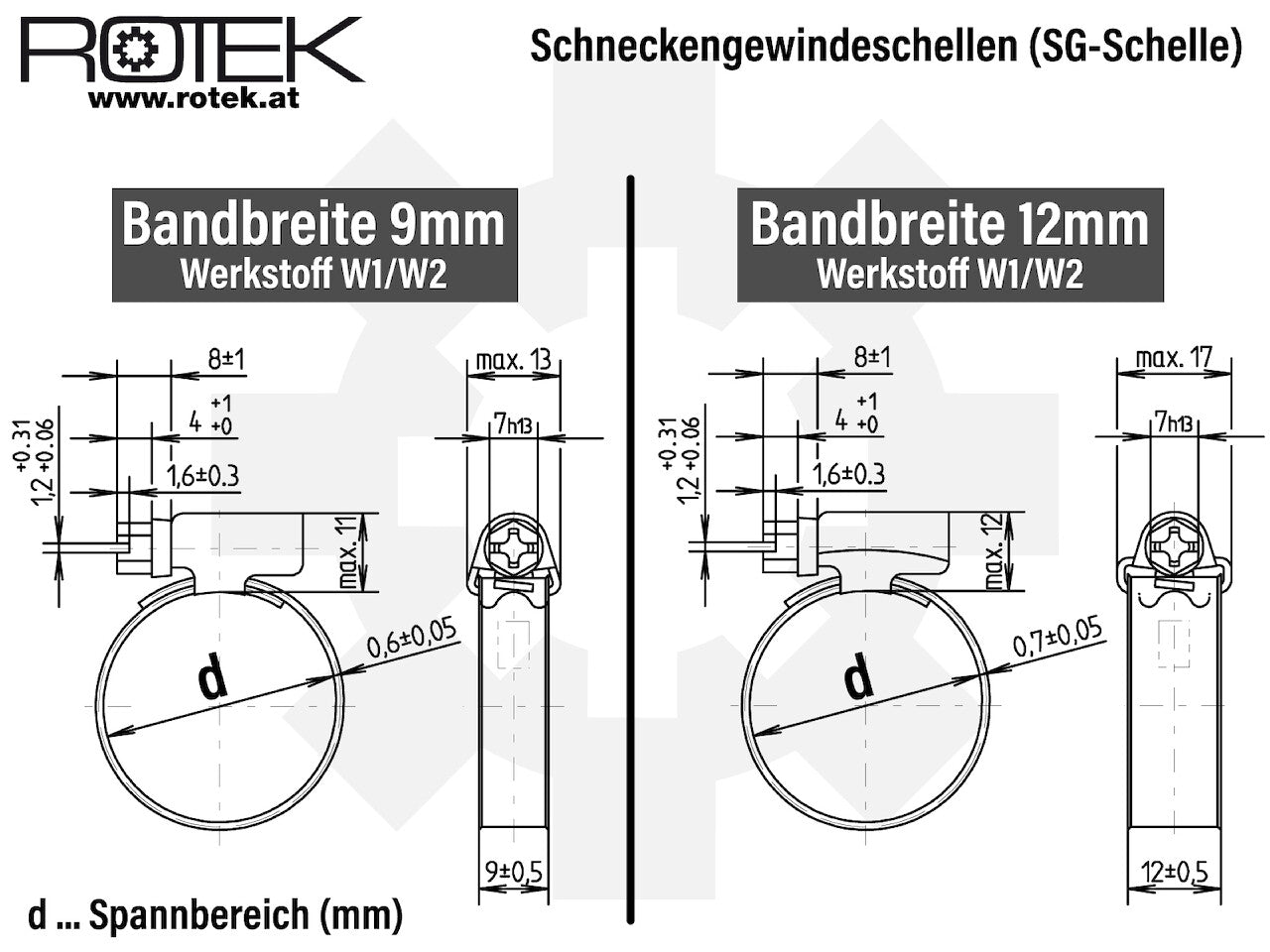 Schneckengewindeschellen mit 9mm oder 12mm breitem Band - je nach Variantenauswahl.